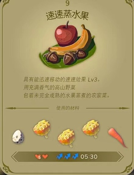 速速莲蓬3个+速速萝卜1个+禽蛋1个=5分钟的3级速度料理。
