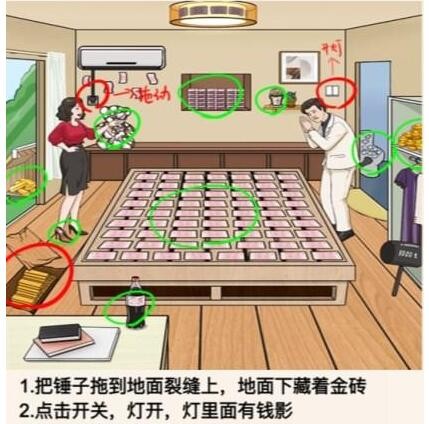 1、一代沙雕找出强哥藏私房钱的地方先把锤子拖到地面裂缝上,地面下藏着金砖。