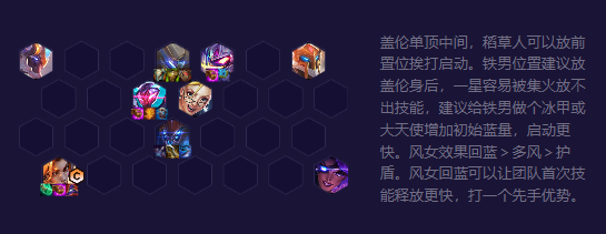 前两个阶段不出强化,4-2优先拿铁男强化,直接4精英。开局出强化优先选择猴子的活力再生。海克斯优选魔盗四件套:魔盗心/魂、小巨人、代谢增速器、背水一战。