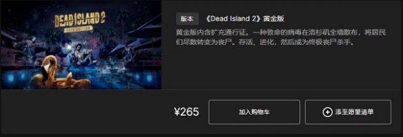 3、死亡岛2黄金版:国区265元,包含游戏本体;扩充通行证、2个高级角色包、黄金武器包、纸浆武器包。