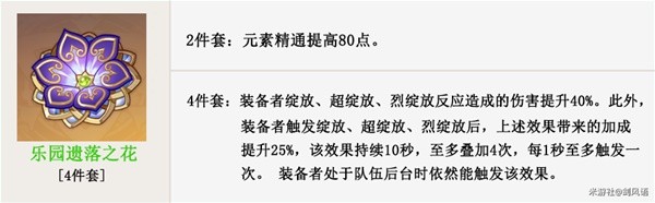 乐园遗落之花×4件套:增加元素精通,提升绽放相关反应伤害,适合超绽放反应队伍,久岐忍佩戴。