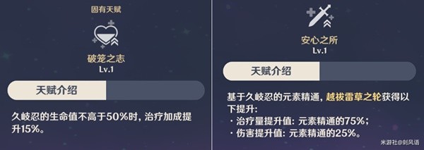 2.固有天赋【破笼之志】低于50%生命值时提升治疗加成。固有天赋【安心之所】基于精通提升E技能的治疗量和伤害,该天赋使得久岐忍可玩精通流,无脑堆精通又不会导致奶量过低。特别在种门队中,久岐忍简直是T0级别。
