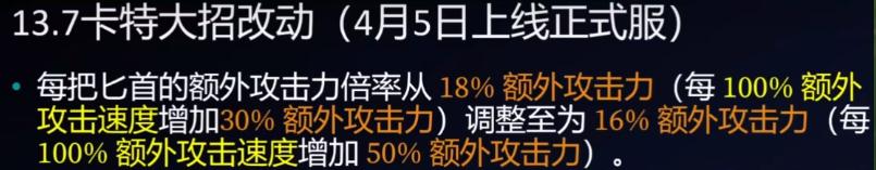 在13.6版本,LOL设计师给卡特琳娜提供了一个极其离谱的加强:R技能的伤害收益可以通过攻速获取,并且这个获取比例还不低!这意味着海妖攻速特效流卡特的玩法在一瞬间飞跃成为当前版本主流。