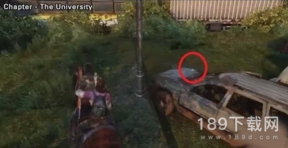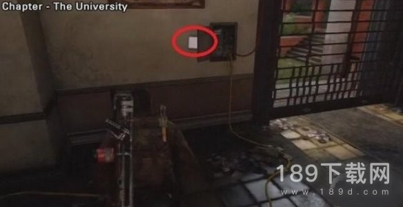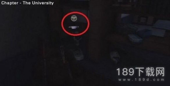 进入大学后穿过第一个空地,在下一个区域的右侧有一个车库,里面有工作台,上楼到顶层,进入阳台,拐角的地面上。