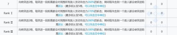 基础状态下会向前突进2格,并对周围所有敌人造成相当于攻击力一定百分比的伤害,每攻击到一个敌人都会使突进延长1格,最多延长至5格,可对空,技能结束后会回到部署的格子里