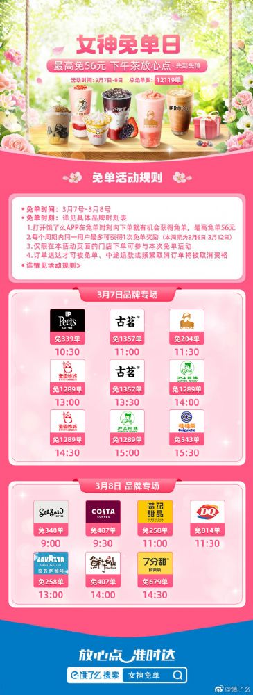今天是三八妇女节,饿了么也推出了“免单日”,不用猜时间,对照攻略里的时间、品牌、名额,参与就行啦!依旧是先到先得,总计12119个免单名额~记得,上饿了么搜【女神免单】进入活动页下单才行哦!