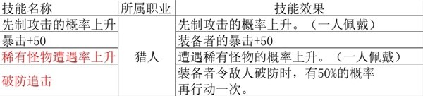 猎人的被动,稀有怪物遭遇率上升,包含猫咪,章鱼以及巢穴Boss的重复遇敌率上升。捕捉特定怪物十分好用。只需一人佩戴即可,多人携带效果不会叠加。