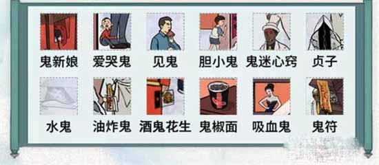 鬼新娘、爱哭鬼、见鬼、胆小鬼、鬼迷心窍、贞子、水鬼、油炸鬼、酒鬼花生、鬼椒面、吸血鬼、鬼符