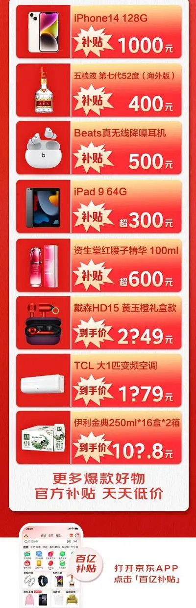 京东百亿补贴涵盖了全品类商品,不仅有最高补贴千元的iPhone,茅台、五粮液、戴森吹风机等爆款尖货,电视、洗衣机、电冰箱、电脑、打印机等3C家电,还有厨具、抽纸、美妆、生鲜、零食、营养保健等生活日用,从而满足大家工作生活方方面面的需求。