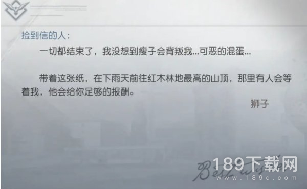 三、遇难者在坐标地点的木棚下面,玩家可以捡到一封邮件,然后打开邮件。后面在下雨的天气去红木森林的山顶找到接头人。