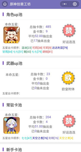 具体位置:打开微信-公众号走索“原神创意工坊”-点击小程序tab-抽卡分析