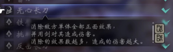 大部分玩家都知道的无心长刀。这个写的效果是“消除敌方单体全部正面效果”。