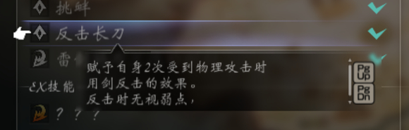 反击长刀随着使用BP增加反击次数。光承受的物理攻击段数越多,反击对应次数越多(不能超过自身储存次数)。