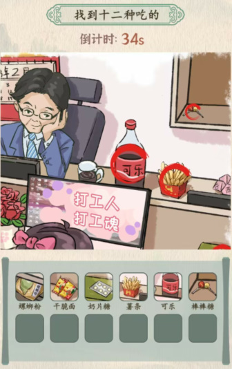找到十二个老物件:<螺蛳粉><干脆面><奶片糖><薯片><可乐><棒棒糖><跳跳糖><泡泡糖><小鱼仔><辣条><煎饼果子>