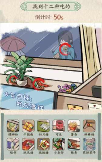 4,可以看到这个盆栽俩边都是吃点,左边是小鱼仔右边是辣条,最后拉开窗帘,可以看到外面的小姐姐手中拿着煎饼果子,那么十二种食物找完。