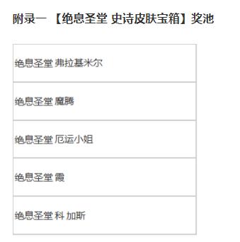 若玩家在打开宝箱时已经拥有奖池内所有绝息圣堂史诗品质皮肤,则获得随机优先未拥有皮肤一款。