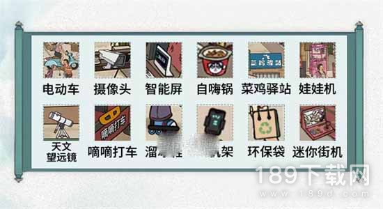 1.答案:电动车、摄像头、智能屏、自嗨锅、菜鸟驿站、娃娃机、天文望远镜、滴滴打车、溜冰鞋、手机架、环保袋、迷你街机