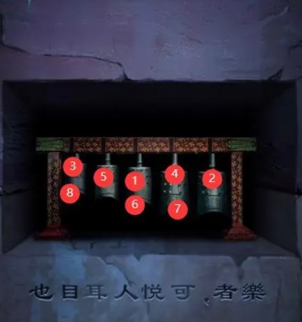 来到外壁上方,拿到【木槌】,根据旁边【35142341 】敲打编钟