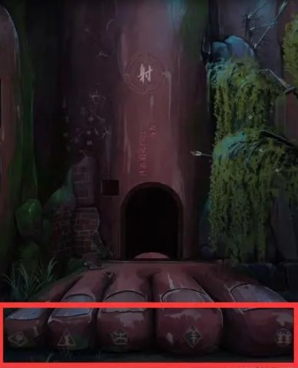 找到【短木棍、柳条】,与脚上的木棍绑在一起获得【简易的长棍】,用长棍弄下柳条上的【弓箭】,根据右边佛像和箭头的提示使用弓箭射击机关如下图所示