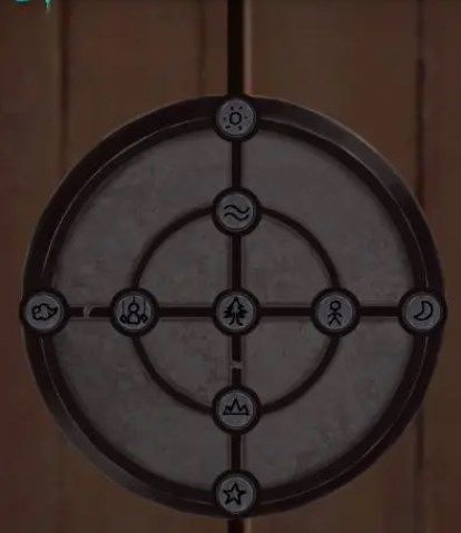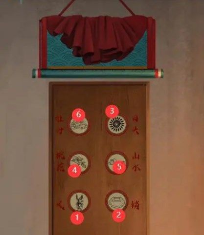 根据挂布的提示在上面倒水浮现花纹,加上人偶房间上方类似的挂饰得知机关如下所示打开进入书房,看完书后,按照下图所示打开机关得到【花纹鼓】,将鼓放到中间挂画后的凹槽里(没看完书和剧情会线索不足),按照图3顺序,在人偶房间移动椅子在门上可以找到左半边画卷。