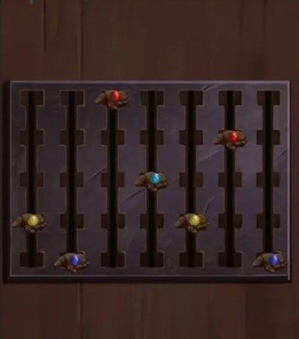 根据画卷上的文字提示如下打开右边的门,根据柜子的提示调整左边的机关如下,中间房间的柜子有个重力迷宫,打开得到木偶制作线索,椅子移回来掀开上方彩色布条可得到【天珠手串】。
