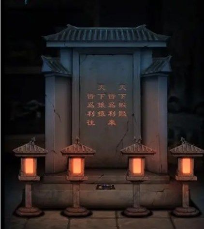 手串放好,调整石灯位置,如下图所示,根据女石像上鼓的提示,得知旋转文字的机关密码为【攘熙往】得到【石狮摆件】,石狮放到女石像下方缺少的位置开启小游戏,完成得到【面具】【发饰】,将发饰插到脏挂布旁边的凹槽,根据挂布上的花纹按下【红3黄4绿1黑1白2】。