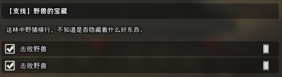 进野猪林走到最里,左下方的位置有个红色宝箱,走过去会遇见隐形的狼。先打掉宝箱前这只,另外一只在旁边的树桩位置。两只全打掉任务完成。