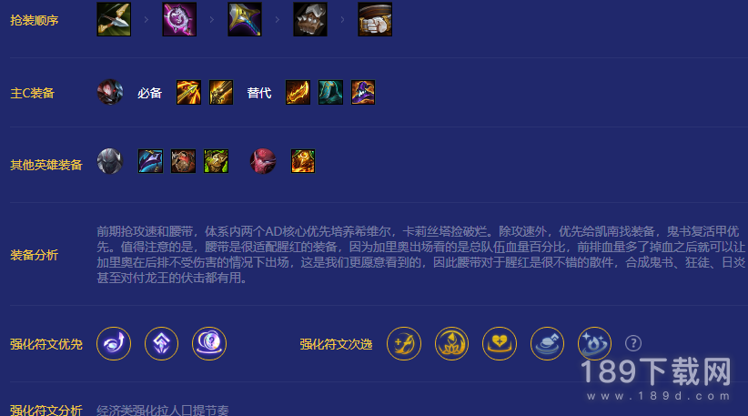 前期抢攻速和腰带,体系内两个AD核心优先培养希维尔,卡莉丝塔捡破烂。除攻速外,优先给凯南找装备,鬼书复活甲优先。
