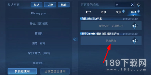 3、找到以后我们将快跑快跑语音包添加道语音默认方案中。