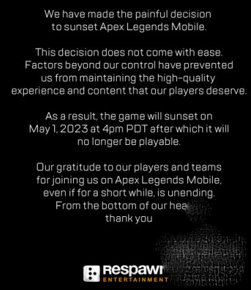 在经历了一个良好的开端后,《Apex Legends Moblie》的游戏质量、内容和节奏出现了问题,EA与合作伙伴共同决定放弃这款游戏。游戏将关闭玩家充值渠道,并从应用商店下架,但已经安装了这款游戏的玩家可以继续游玩,游戏最终将于太平洋时间5月1日下午4点停服。