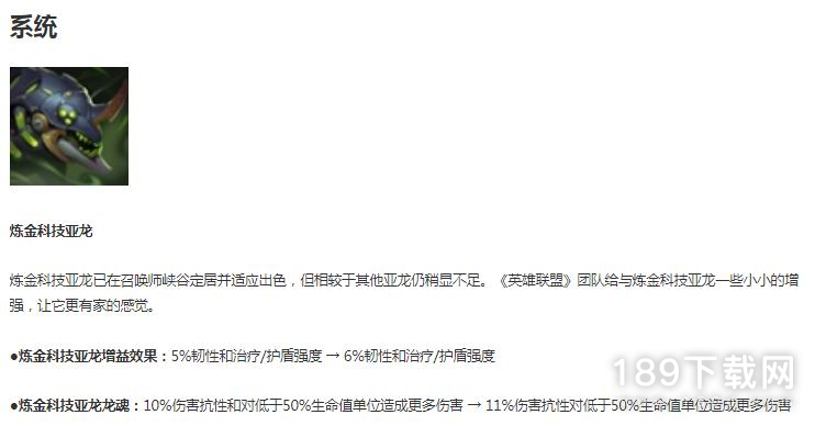 炼金科技亚龙已在召唤师峡谷定居并适应出色,但相较于其他亚龙仍稍显不足。《英雄联盟》团队给与炼金科技亚龙一些小小的增强,让它更有家的感觉。