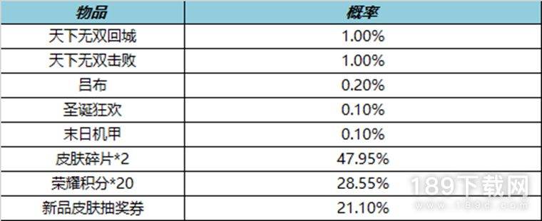 购买红蓝对决(1日),可额外随机获得以下之一:吕布专属击败和回城特效-天下无双、吕布、圣诞狂欢、末日机甲、皮肤碎片*2、荣耀积分*20、新品皮肤抽奖券*1。累计150次必得全部局内特效。