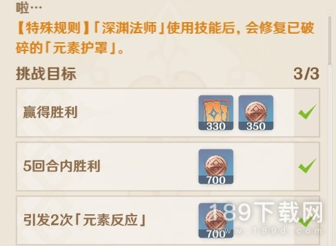 规则:深渊法师使用技能/元素爆发,都会给自己叠两层盾,特别麻烦。破盾挺耗回合的,阵容不好容易拿不满奖励,开局手牌非常关键!