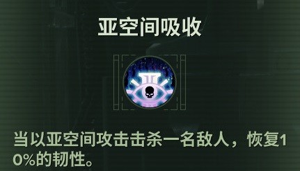 获得亚空间蓄力的被动之后5S内恢复30%韧性(非常实在的恢复韧性的手段不会造成回复韧性的浪费,这个天赋不能叠加只能刷新需要注意)