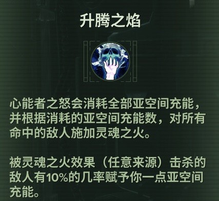 根据你的被动层数对被大招击中的敌人施加被动层数数量的灵魂之火,并且被灵魂之火效果击杀的敌人有10%的概率回复一层被动(这是一个把灵能大招直接质变的天赋,从原来的只能推怪变成了清潮神技,难5表现非常好因为狂信的喷火器肯定需要换弹这时候灵能的一个大招就能让狂信换好子弹并且打出一波伤害)