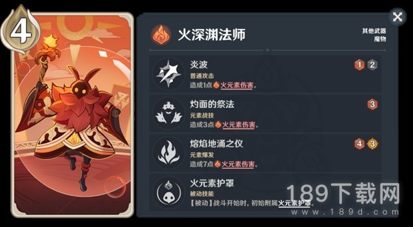 火深渊法师的标准生命值为 4 点, 只能造成火元素伤害, 元素爆发充能需求为 3 点, 爆发伤害为 7 点。
