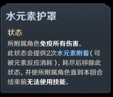 该状态类似元素护盾, 为角色提供 2 次水元素附着, 且只能通过元素反应破除。