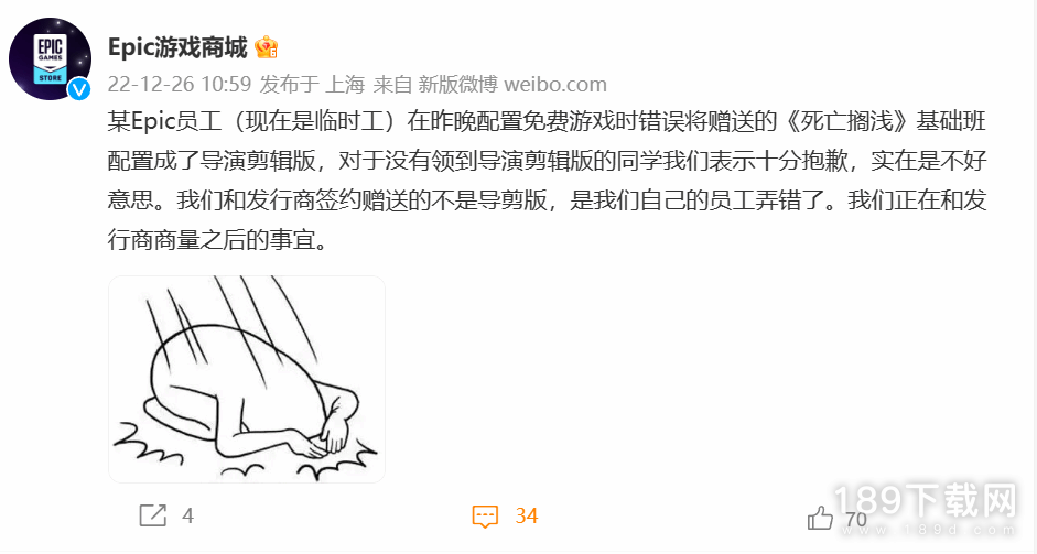 某Epic员工(现在是临时工)在昨晚配置免费游戏时错误将赠送的《死亡搁浅》基础版配置成了导演剪辑版,对于没有领到导演剪辑版的同学我们表示十分抱歉,实在是不好意思。我们和发行商签约赠送的不是导剪版,是我们自己的员工弄错了。我们正在和发行商商量之后的事宜。