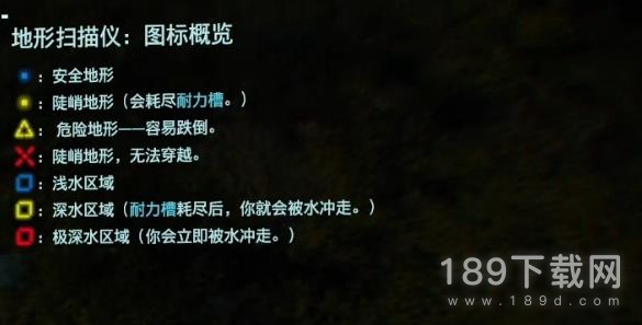 赶路途中,用扫描仪扫描地形,蓝色标记表示平坦安全的区域;黄色标记表示有点危险,要小心通过,注意别摔倒了;红色标记表示深水、陡峭的地形等危险,最好不要靠近。