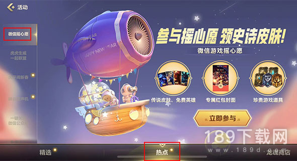 打开英雄联盟手游客户端,点击左侧活动列表,进入活动界面后在底部找到中间的“热点”任务,就可以看到微信摇心愿活动了。