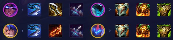 1.巨人杀手(萨弥拉>厄斐琉斯) 2.最后的轻语(萨弥拉>厄斐琉斯) 3.鬼索的狂暴之刃 4.无尽之刃 5.日炎斗篷(瑟庄妮>蕾欧娜) 6.石像鬼石板甲(瑟庄妮>蕾欧娜) 7.狂徒铠甲(瑟庄妮>蕾欧娜)