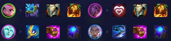 1.蓝霸符(索拉卡>娑娜) 2.珠光护手(索拉卡>娑娜) 3.巨人杀手 4.石像鬼石板甲(艾克>安妮) 5.日炎斗篷(艾克>安妮) 6.爱心使者纹章 7.离子火花 8.大天使之杖